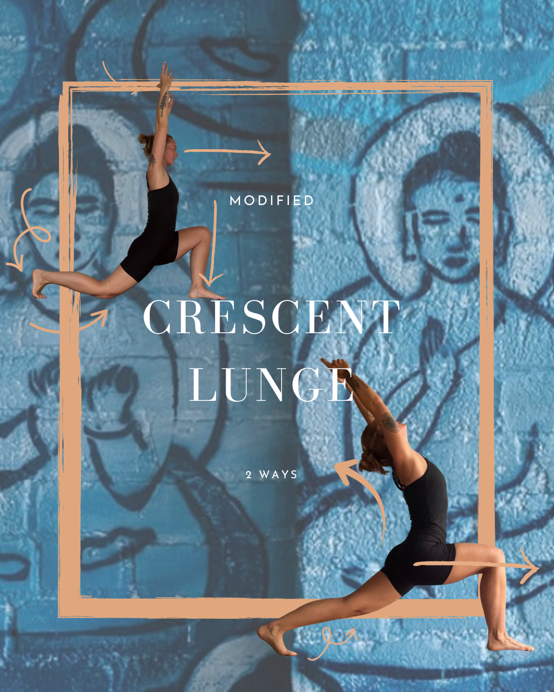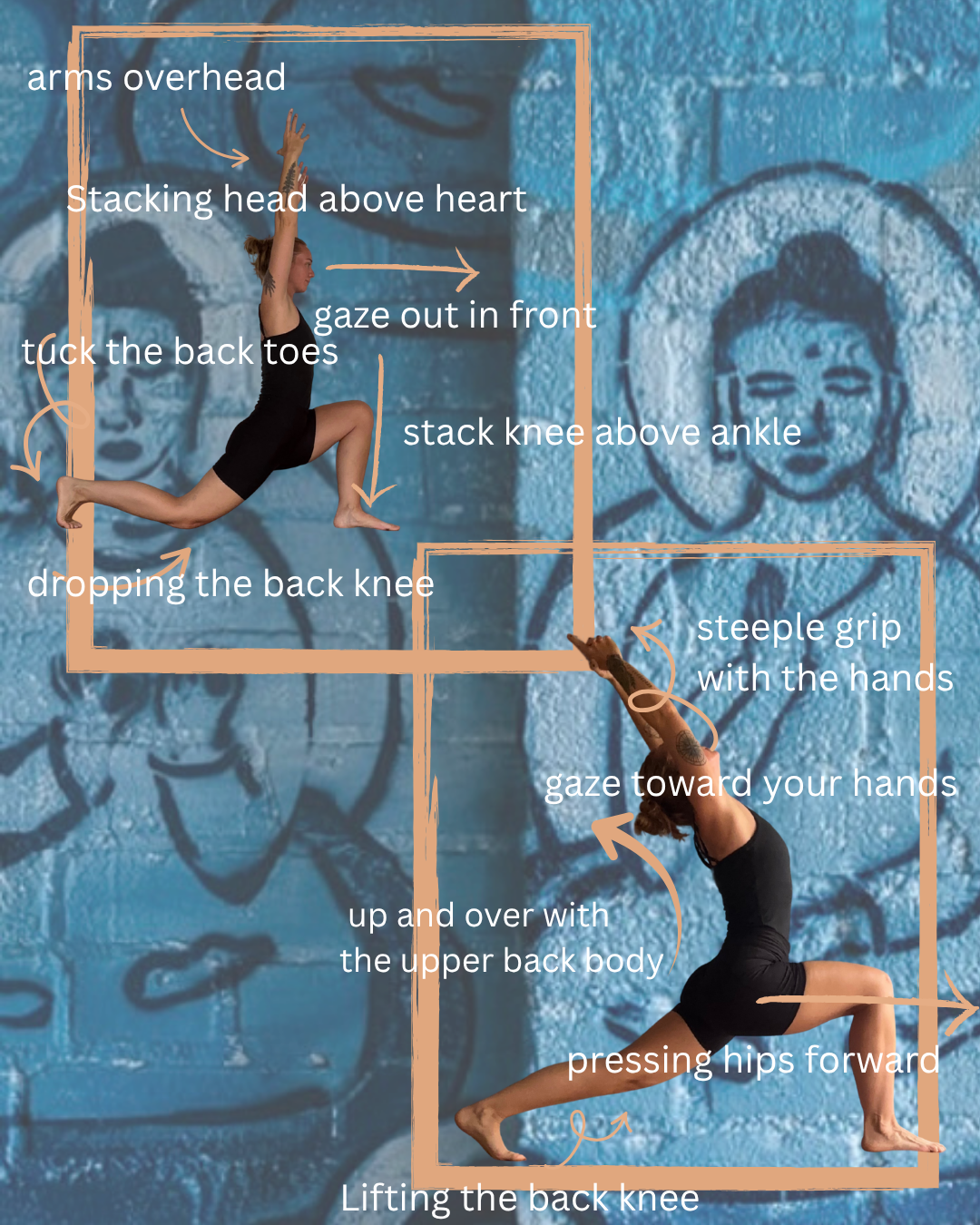 To go deeper, we can keep the lift in the back knee and reach the arms back, thinking “up and over” with the shoulder blades. This will create a rounding in the upper back body and a gentle backend. This opens the heart and provides a lengthening of the belly. Pressing the hips forward may deepen our spinal arch. It’s important to breathe, keeping the front knee above the front ankle - it may even land your front leg at a 90-degree angle.